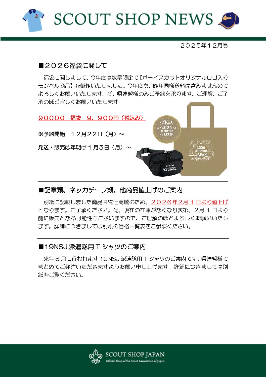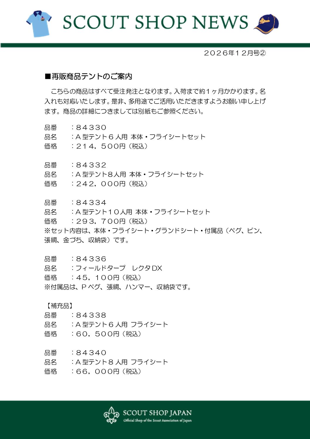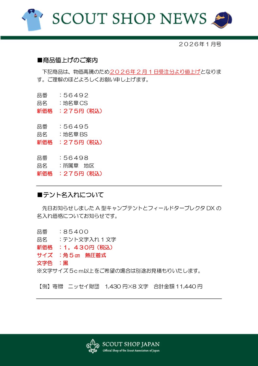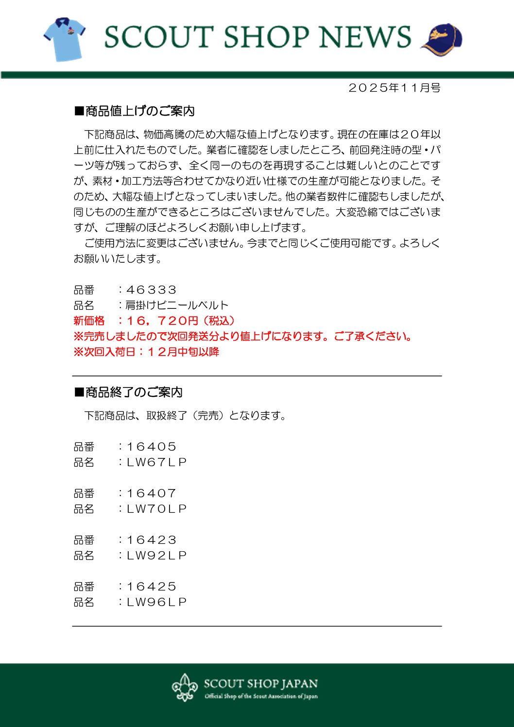 ボーイスカウトエンタープライズの11月以降の「SCOUT SHOP NEWS」の新商品と商品値上げが対象になります。