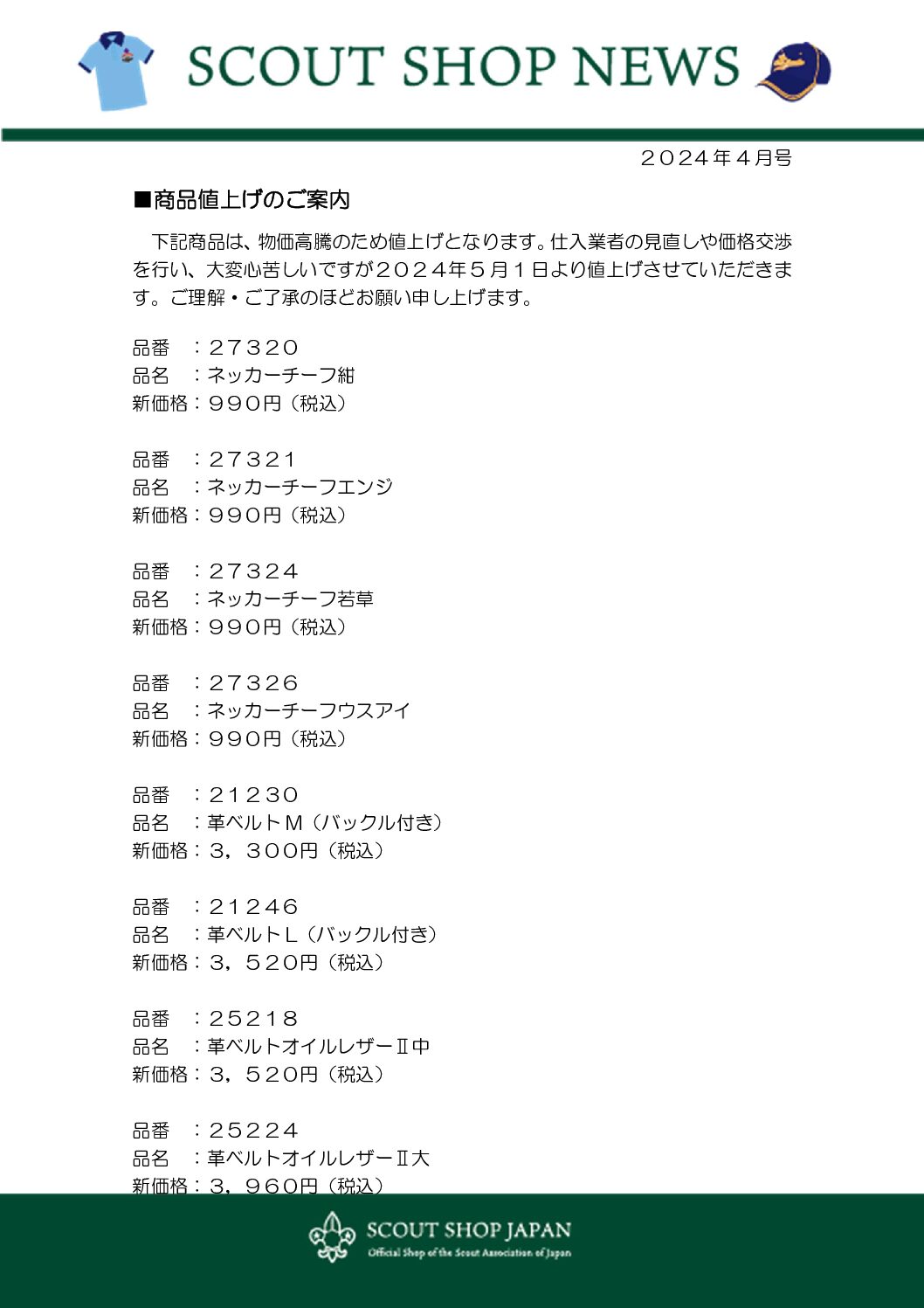 ボーイスカウトエンタープライズの8月以降の「SCOUT SHOP NEWS」の新商品と商品値上げが対象になります。